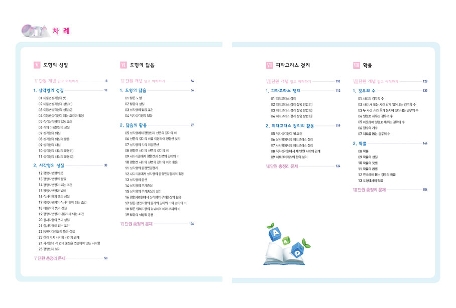 • 개념 체크 문제를 통해 잊기 쉬운 개념을 한 번 더 확인할 수 있게 하였고, 단원 총정리 문제를 풀면서 각 단원의 모든 개념, 유형을 총정리 학교시험에 대비할 수 있도록 하였습니다.