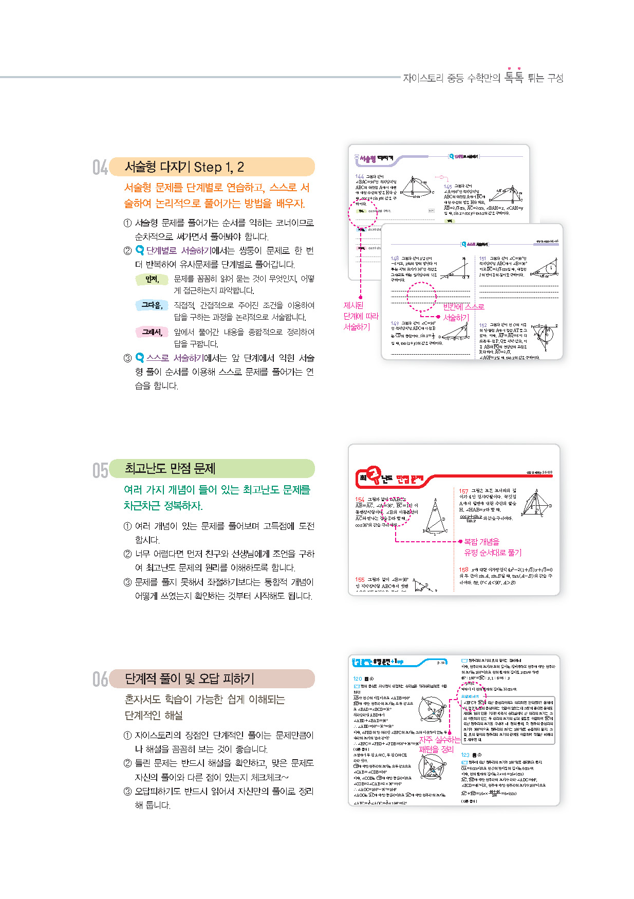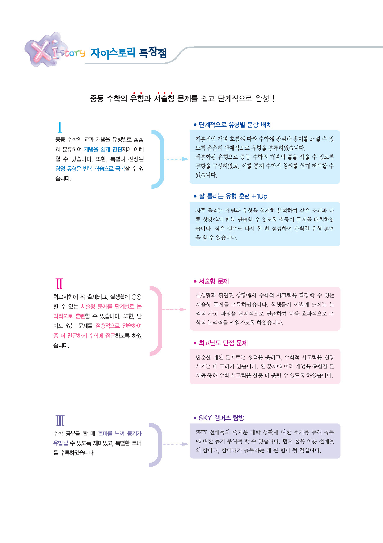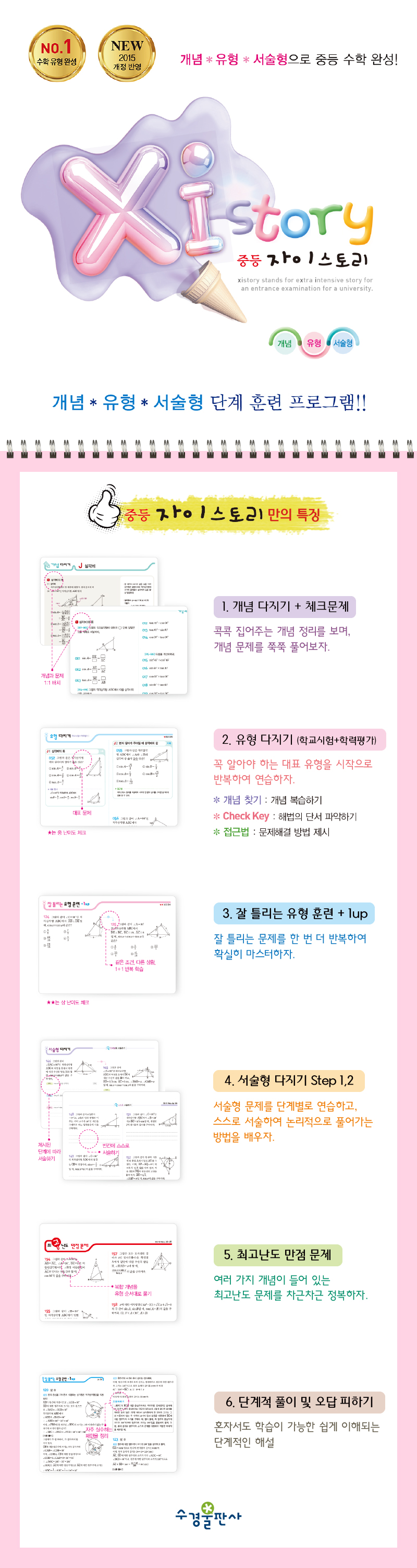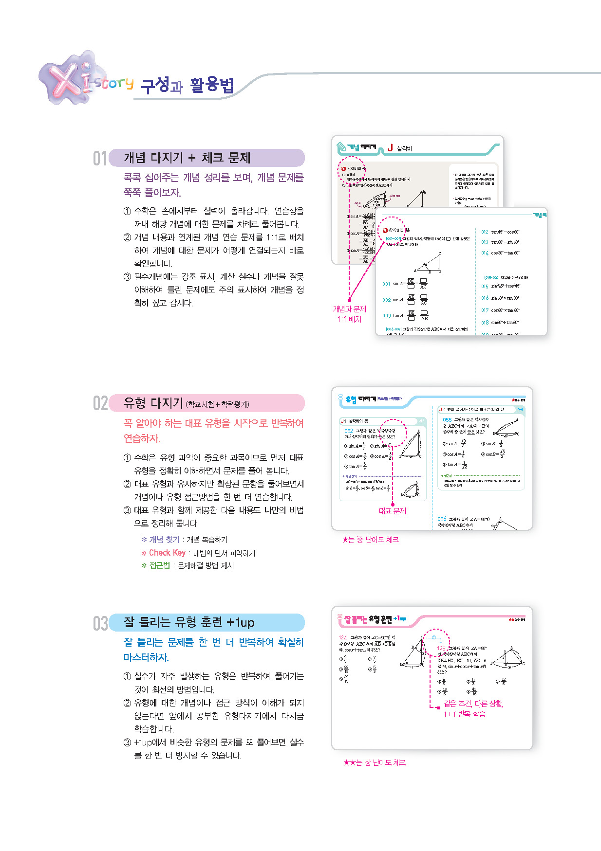 자이스토리는 쉽게 이해되도록 개념과 유형을 촘촘히 쪼개고, 또 잘 틀리는 문제들을 모아서 1: 1로 반복 훈련하게 구성했습니다.