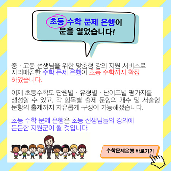 초등 수학 문제 은행이 문을 열었습니다!중·고등 선생님을 위한 맞춤형 강의 지원 서비스로 자리매김한 수학 문제 은행이 초등 수학까지 확장하였습니다.이제 초등수학도 단원별·유형별·난이도별 평가지를 생성할 수 있고, 각 항목별 출제 문항의 개수 및 서술형 문항의 출제까지 자유롭게 구성이 가능해졌습니다. 초등 수학 문제 은행은 초등 선생님들의 강의에 든든한 지원군이 될 것입니다.