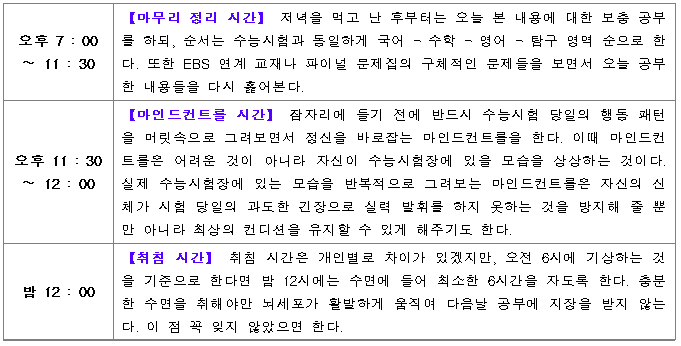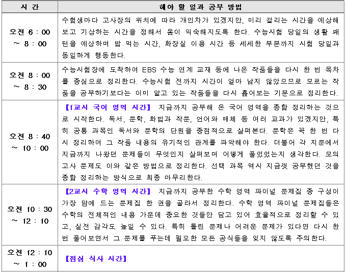 따라서 수능시험을 5일 남겨 둔 이때에는 한 문제를 푸는 것보다 실제 수능시험 당일 시간표와 동일하게 공부하는 패턴으로 마지막 마무리 학습을 하는 것이 무엇보다 중요하다. 모르는 것은 미련을 버리고, 아는 것을 확실하게 머릿속에 담아서 시험장에 들어간다는 자세로 공부에 임한다.