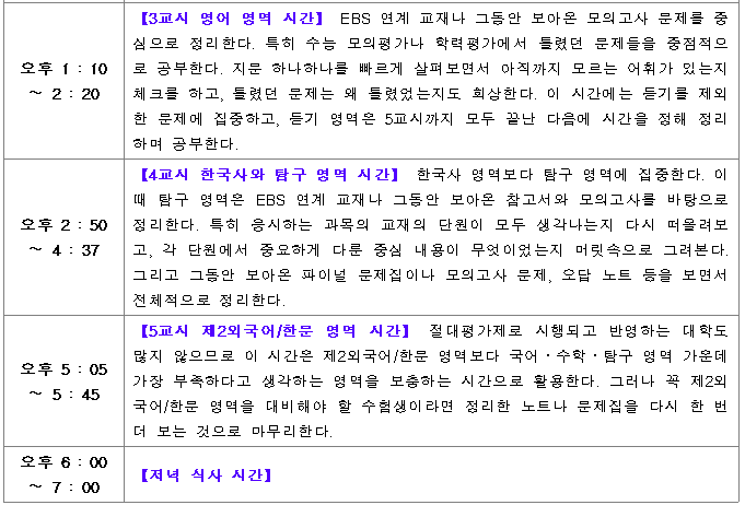 아울러 실제 수능시험 시간에 맞춰 마무리 대비할 수 있도록 계획을 세울 필요가 있다. 학교에서 자습이 이루어지는 경우에는 아침부터 수능시험에 따라 공부할 수 있도록 계획을 세우고, 수업이 계속되는 경우에는 수업 이후 공부하는 순서를 ‘국어 - 수학 - 영어 - 탐구 영역 순’으로 공부할 수 있도록 계획을 세우는 것이 좋다.