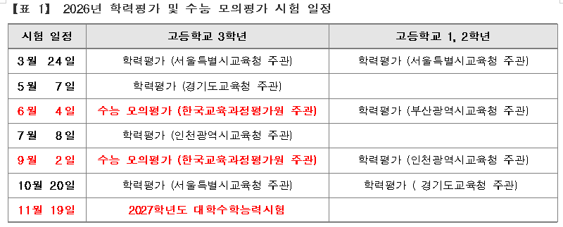 현행 대학입시 제도의 마지막 시행이 될 2027학년도 대학입시를 치르게 될 예비 고등학교 3학년 학생과 새 교육과정인《2022 개정 교육과정》로 공부하는 예비 고등학교 1, 2학년 학생들이 내년에 치르게 될 2026년 전국연합학력평가(이하 학력평가) 시행 일정이 확정되었다.