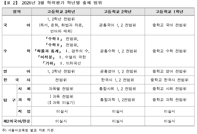 3월 첫 학력평가의 고3 출제 범위는 국어와 영어 영역의 경우 고등학교 1, 2학년 전 범위이다. 그리고 수학 영역은 공통 과목인 「수학Ⅰ」과 「수학Ⅱ」 전 범위이고, 선택 과목인 「확률과 통계」는 ‘Ⅰ. 경우의 수’, 「미적분」은 ‘Ⅰ. 수열의 극한’ 「기하」는 ‘Ⅰ. 이차곡선’에서 출제하고, 필수 응시 영역인 한국사 영역은 전범위에서 출제한다.