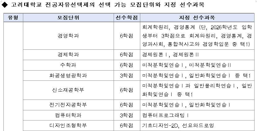고려대 무전공 입학자들의 유형별 선택 가능한 모집단위와 선수과목은 아래 도표와 같다.