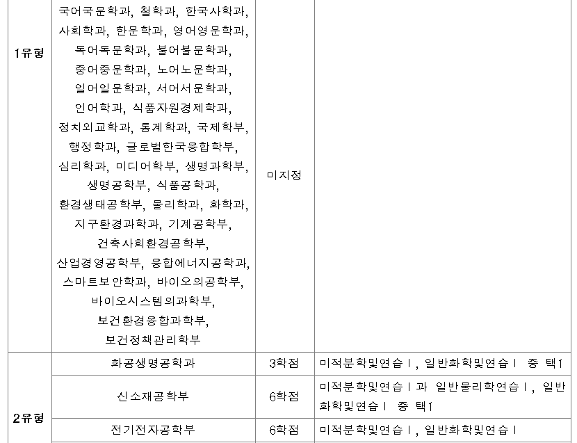 1유형에서는 경영학과 등 46개 모집단위, 2유형에서는 기계공학과 등 6개 모집단위 선택 가능
