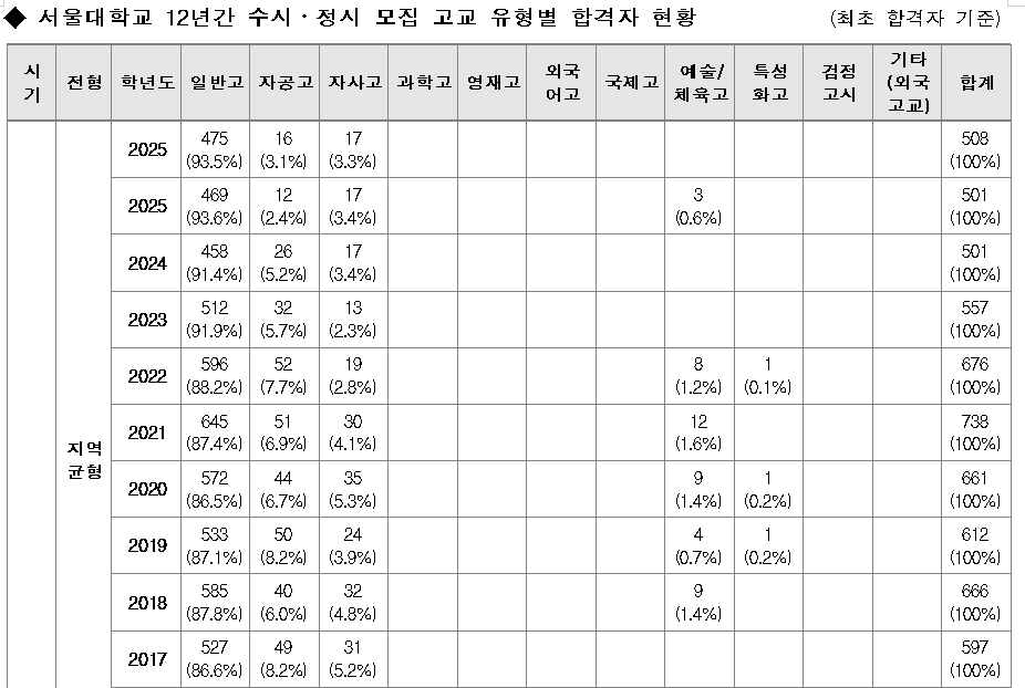서울대학교 2026학년도 고등학교 유형별 합격자 현황