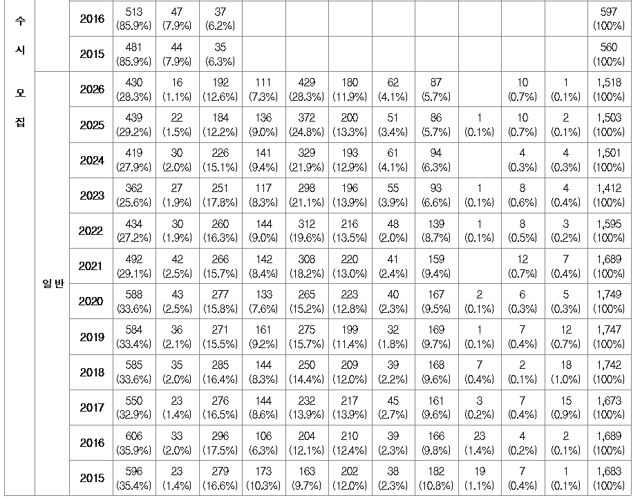 일반고는 60.1%(755명)로 2025학년도에 59.0%(733명)이었던 것보다 1.1%포인트 증가했고, 자사고는 21.5%(270명)로 2025학년도에 20.0%(248명)이었던 것보다 1.5%포인트 증가했으며, 자공고는 1.5%(19명)로 2025학년도에 0.9%(11명)이었던 것보다 0.6%포인트 증가했다. 그리고 검정고시 출신자는 3.2%(40명)로 2025학년도에 2.3%(29명)이었던 것보다 0.9%포인트 증가했다.