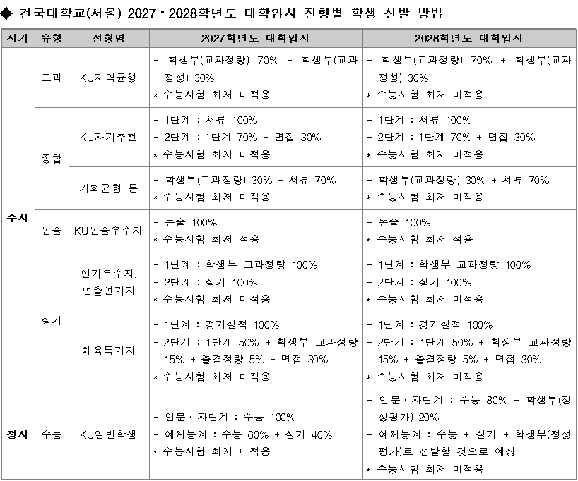 이에 여기에서는 건국대가 발표한 2028학년도 대학입시 주요 사항을 수시ㆍ정시 모집에서 선발하는 전형 유형별로 구분하고 2027학년도 대학입시와 연계하여 살펴본다. 다만, 이는 사전 예고로 발표한 것이므로 확정된 구체적인 사항은 4월 말 발표될 《건국대학교 2028학년도 대학입학전형 시행계획》을 확인하고 숙지하길 당부한다.