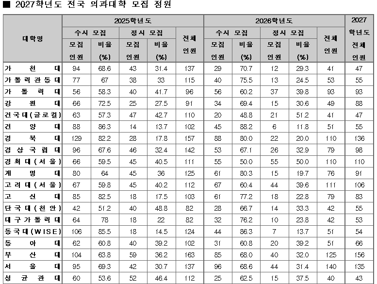 이와 같은 의과대학 증원은 교육부가 3월 13일 발표한 〈2027학년도∼2031학년도 의과대학 학생 정원 배정안 사전 통지〉 보도자료를 담긴 내용으로 증원 의과대학은 서울 소재 8개 대학(가톨릭대ㆍ경희대ㆍ고려대ㆍ서울대ㆍ연세대ㆍ이화여대ㆍ중앙대ㆍ한양대)을 제외한 전국의 32개 의과대학이 이에 해당한다.