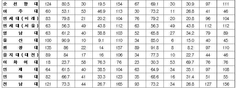 이들 모집 인원을 해당 지역으로 구분하여 보면 부산ㆍ울산ㆍ경남 지역 6개 대학 97명, 대전ㆍ충남 지역 5개 대학 72명, 대구ㆍ경북 지역 5개 대학 72명, 강원 지역 4개 대학 63명, 광주 지역 2개 대학 50명, 충북 지역 2개 대학 46명, 충북 지역 2개 대학 46명, 전북 지역 2개 대학 38명, 제주 지역 1개 대학 28명, 인천ㆍ경기 지역 4개 대학 22명이다.