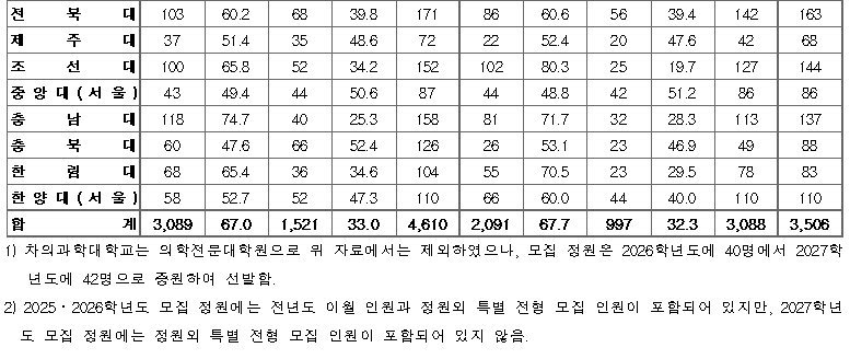 2025학년도 대학입시에서 1,521명을 증원하여 선발했다가 2026학년도에 증원을 백지화하고 2024학년도와 동일한 모집 정원으로 감원하여 선발했던 의과대학이 2027학년도 대학입시에서는 490명을 증원 선발한다. 그리고 이러한 선발은 2027학년도에만 증원하여 선발하는 것이 아니라 2028학년도부터 2031학년도까지 매년 613명을 추가 증원하여 선발할 계획이라고 한다.
