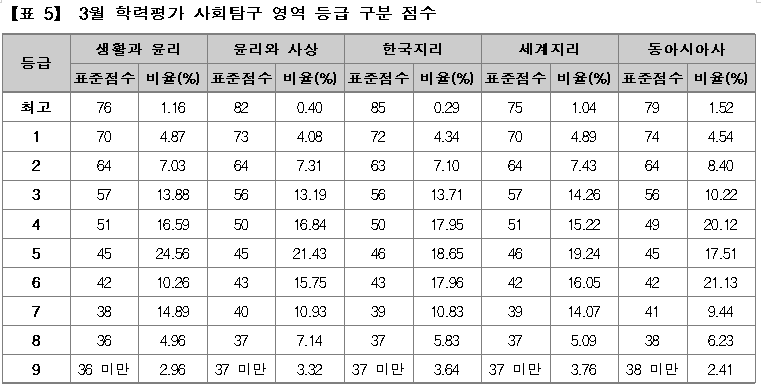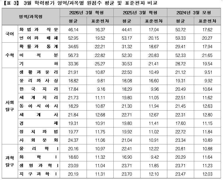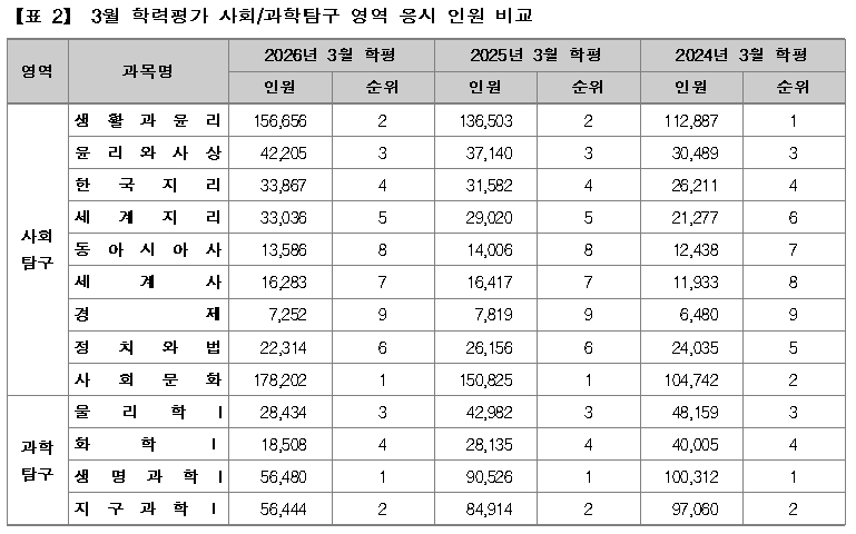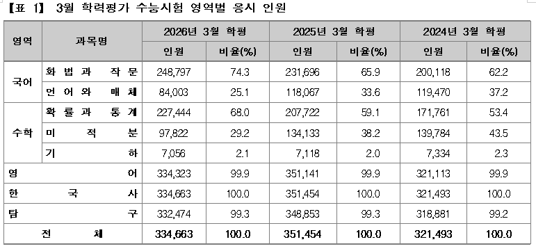 한편, 이번 3월 학평에서 국어 영역 화법과작문과 수학 영역 확률과통계 응시자가 크게 증가한 것은 2027학년도 수능시험이 현행 대학입시 제도에서 시행하는 마지막 시험이라는 점에 대한 부담으로 대비가 좀 더 수월한 과목으로 더 많이 응시한 결과 때문으로도 보인다.