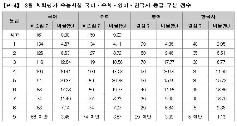3월 학평은 비록 졸업생들이 응시하지는 않았지만, 시험 응시 집단이 실제 수능시험과 유사하다. 그리고 3월 학평 성적 결과표에는 수능시험과 유사한 집단 속에서 수험생의 상대적 위치를 가늠하는 지표로 활용 가능한 개인별 성적인 영역/과목별 등급과 원점수 배점, 학교 및 전국 백분위, 영역별 조합에 따른 전국 석차 등이 함께 제공된다.