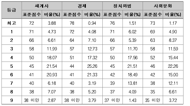 그리고 선택 과목별 응시자 비율은 국어 영역의 경우 화법과작문 74.3%(248.797명), 언어와매체 25.1%(84.003명)로 화법과작문이 많았고, 수학 영역의 경우에는 확률과통계 68.0%(227,444명), 미적분 29.2%(97,822명), 기하 2.1%(7,056명)로 확률과통계가 가장 많았다.